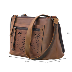 The Brynlee Distressed Crossbody by Lady Conceal is made of genuine distressed leather with floral laser cuts for added beauty and ample storage capacity. It features 3 main interior compartments. The front zipper compartment has two open slip pockets and a zipper pocket. The center compartment is secured with a magnetic closure. It also features two open slip pockets, a zipper pocket plus a key strap. The back compartment with zipper closure provides additional storage. Behind the laser cuts are two additional pockets, one with a magnetic closure for your cell phone and another zipper pocket. The adjustable crossbody strap measures 28”-54” (drop 13”- 27”).