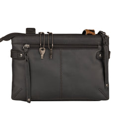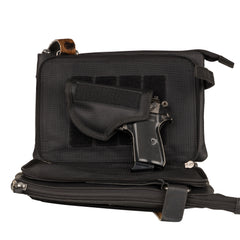Discreetly in the center of the bag is a purpose-built concealment compartment which allows for equal weight distribution. This compartment is safeguarded by ambidextrous, key-locking YKK zippers, providing you with uncompromised security and peace of mind. The design allows for an easy top draw. Plus, a right or left draw is available when side straps are unbuttoned. It includes 4 keys and measures 9.5” L x 6.5” H. It is constructed of durable nylon and can accommodate up to a large-frame handgun. A universal holster is included which features Velcro hooks on both sides for a secure fit in the concealment pocket.