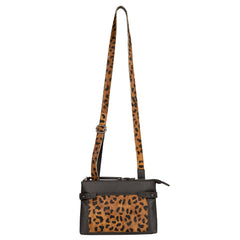 The Paige Leather Concealed Carry Crossbody by Lady Conceal is crafted from soft full-grain leather and features a unique Thai Leopard hair-on-hide front. This compact purse can store all essentials, including a firearm, and has three main compartments. The front RFID-protected compartment has one large open slip pocket, a zipper pocket, a large gusset pocket for a cell phone plus 4 card slots. The back zippered compartment features 1 zippered pocket, 3 open slip pockets, and a leather strap for your keys. The center compartment secures your firearm, while a slip pocket with a magnetic closure is concealed behind the leopard hide. The back also features a full-length zippered pocket. The adjustable crossbody strap measures 30.5” – 57.5" L by 1" W.