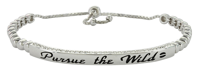 A take on the modern bar jewelry trend, this sterling silver bracelet has a center bar with ‘Pursue the Wild’ in a script font across it with added detail along the long sides with a line of brilliant clear stones and a line of Cervidae elk tracks along the back. Short little silver cylinders act as links on either side while further down a small box chain fastens the bracelet together with a lariat style clasp for easy wear.