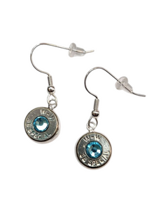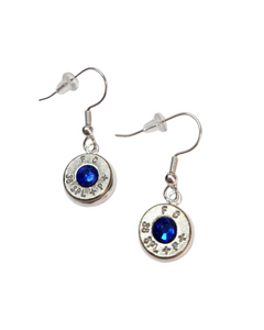 Our signature dangle earrings are fun and sophisticated. Small in design with a bold statement. They are small and light weight. They come in a wide array of colors! Made with 38 caliber head stamps.