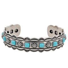 The only thing that rivals the beauty of this bracelet is the stars in the Southwest sky. At the top and bottom of the cuff is a scalloped etched edge that adds to the southwest style of the bracelet. The center of the silver-finished cuff is alternating raised stars and square turquoise stones that wrap around your wrist. Black antiquing brings out the details and completes this bold design. One size fits most. Stone color will vary.